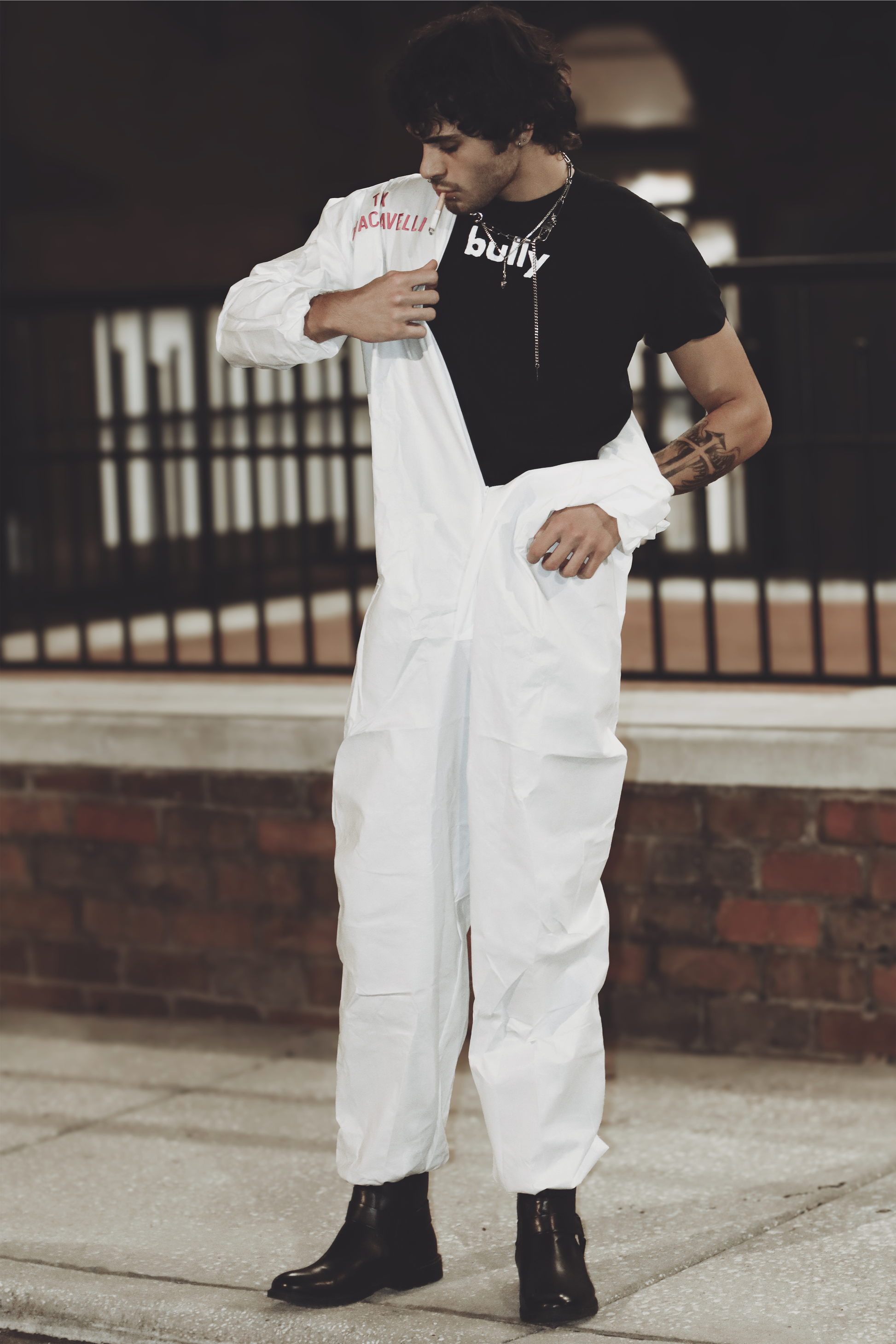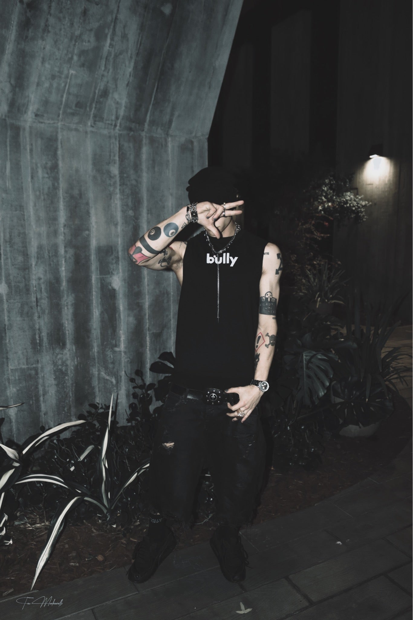 BULLY A-SHIRT — 100% cotton. Slightly cropped. Each piece hand-crafted by Tex Machiavelli — stencil cut, seams drawn, plastisol-painted by hand. Imperfect. Personal. A mark of control and defiance. The word bully bleeds across the chest like an accusation, or a confession. Made one at a time.