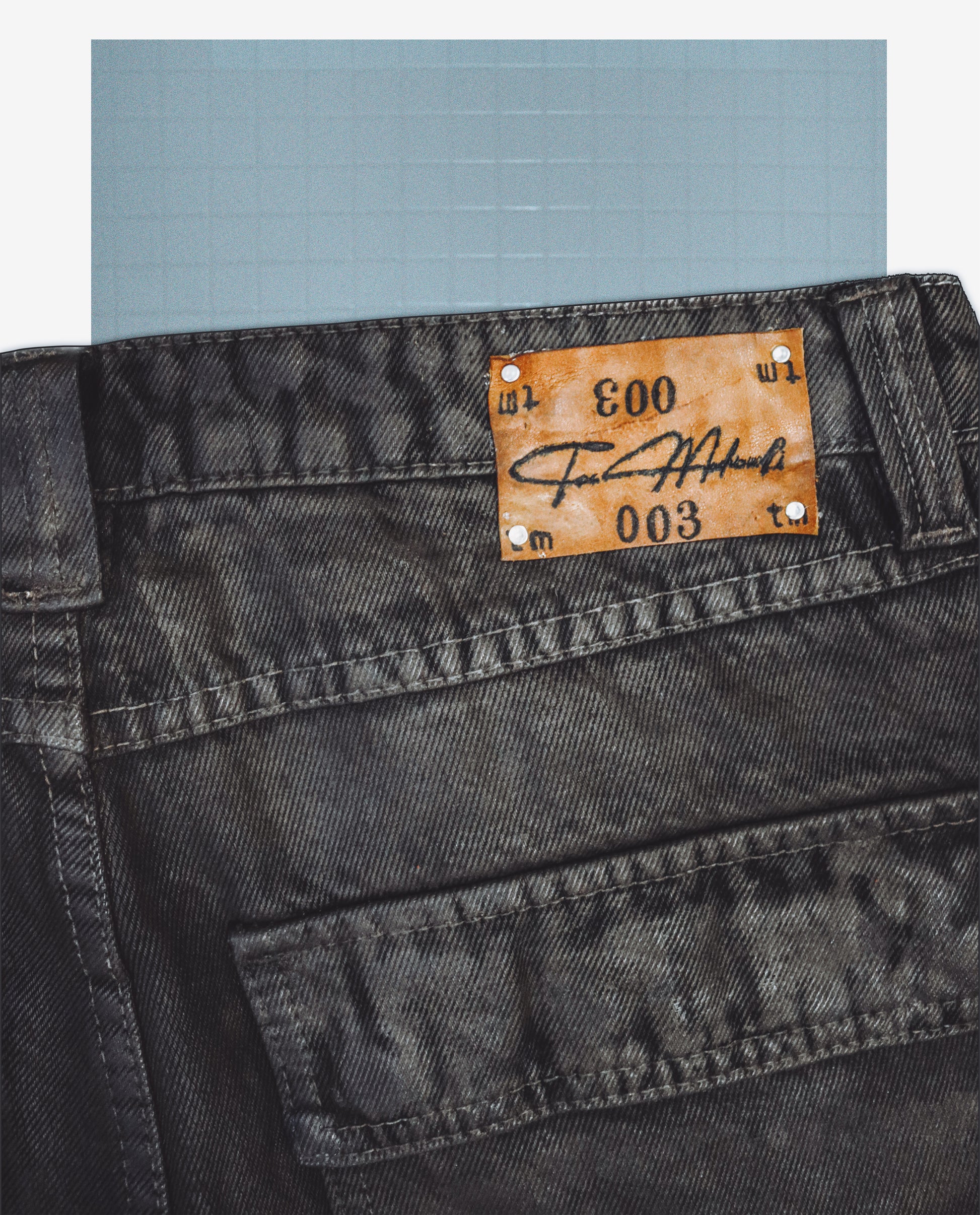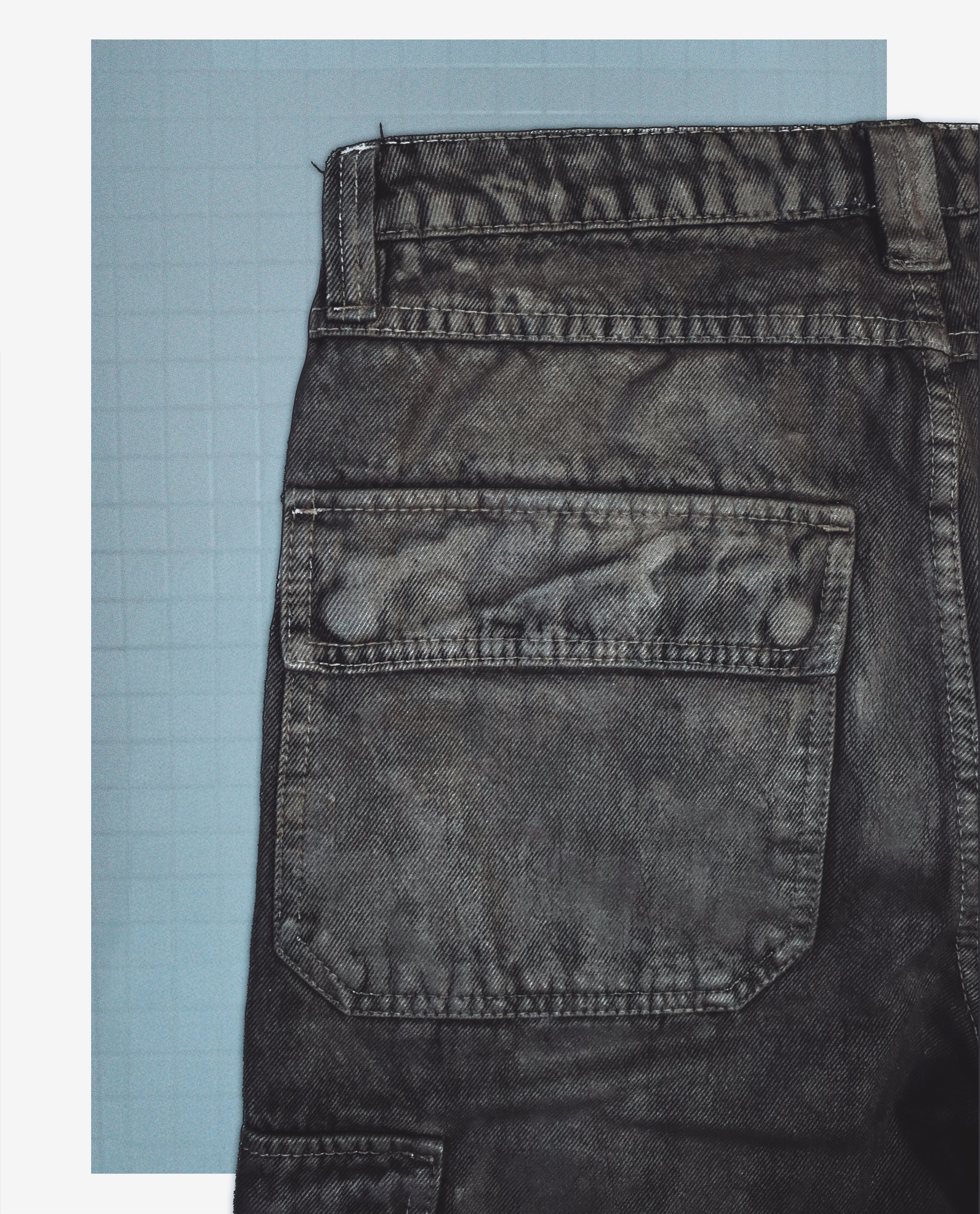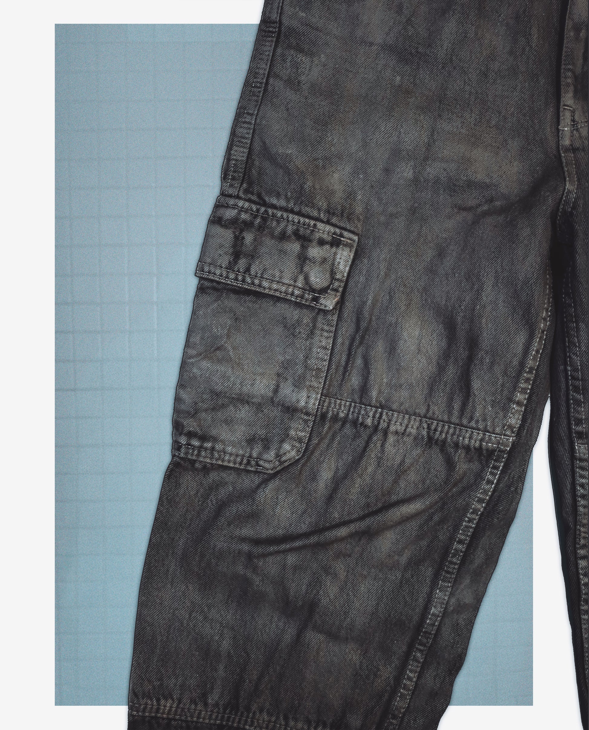 Built with double cargo pockets and reinforced seams, the structure feels utilitarian yet sculptural. The fabric bears irregular shadowing, the product of natural abrasion rather than design—an index of touch and pressure.