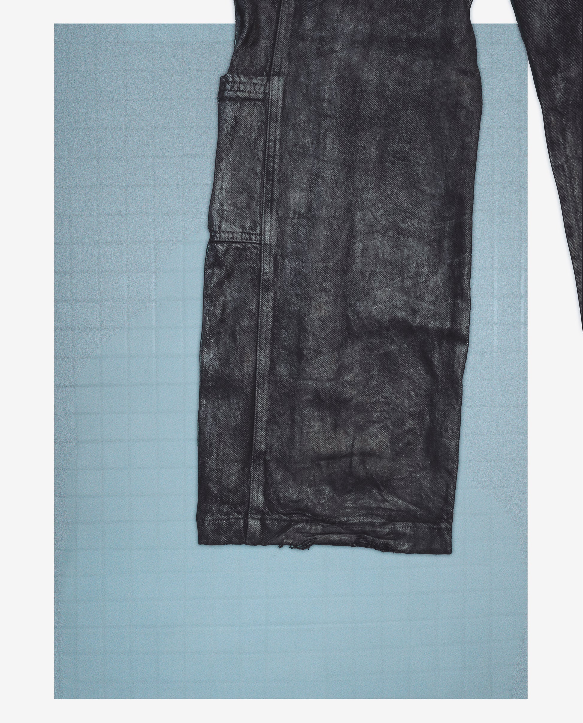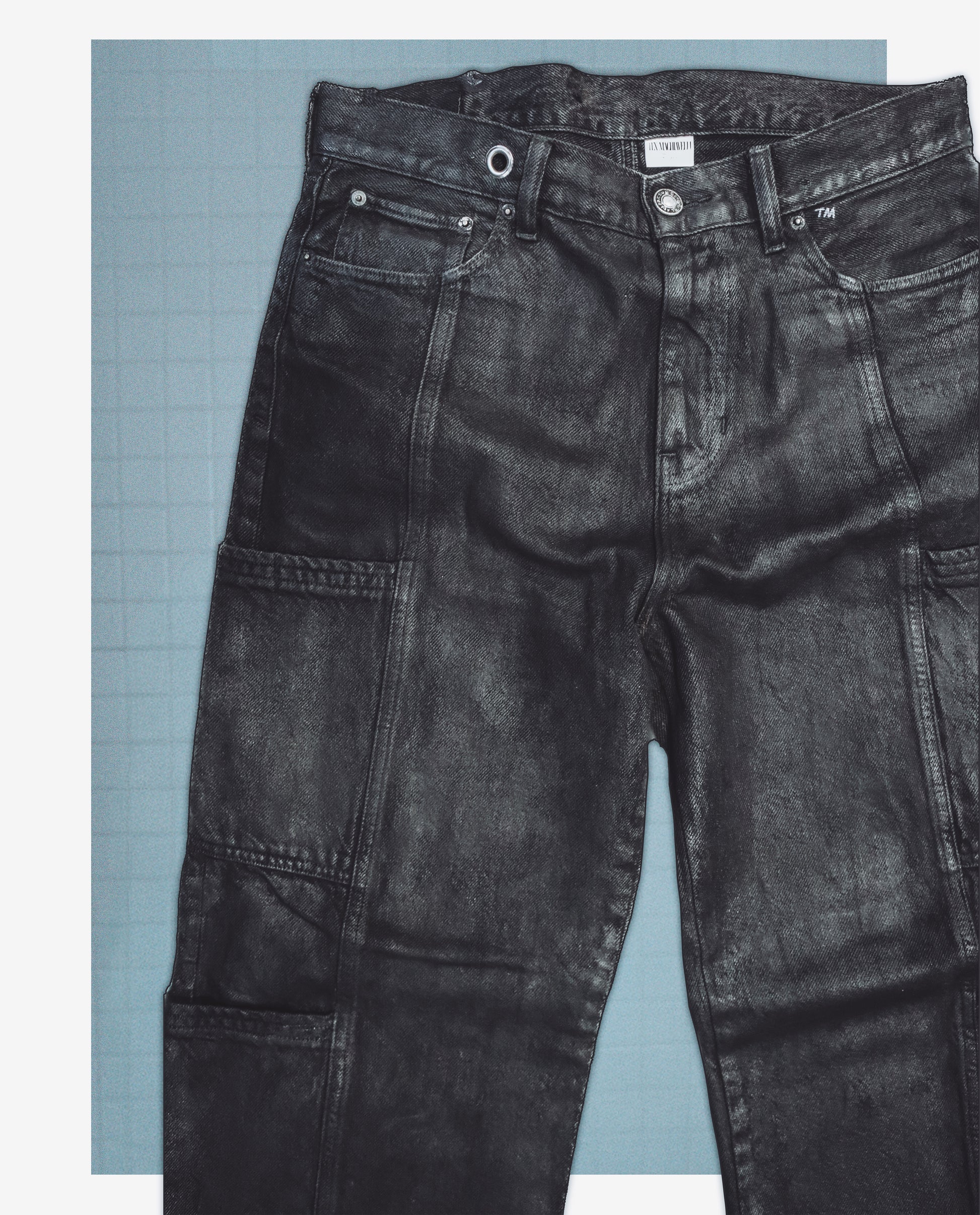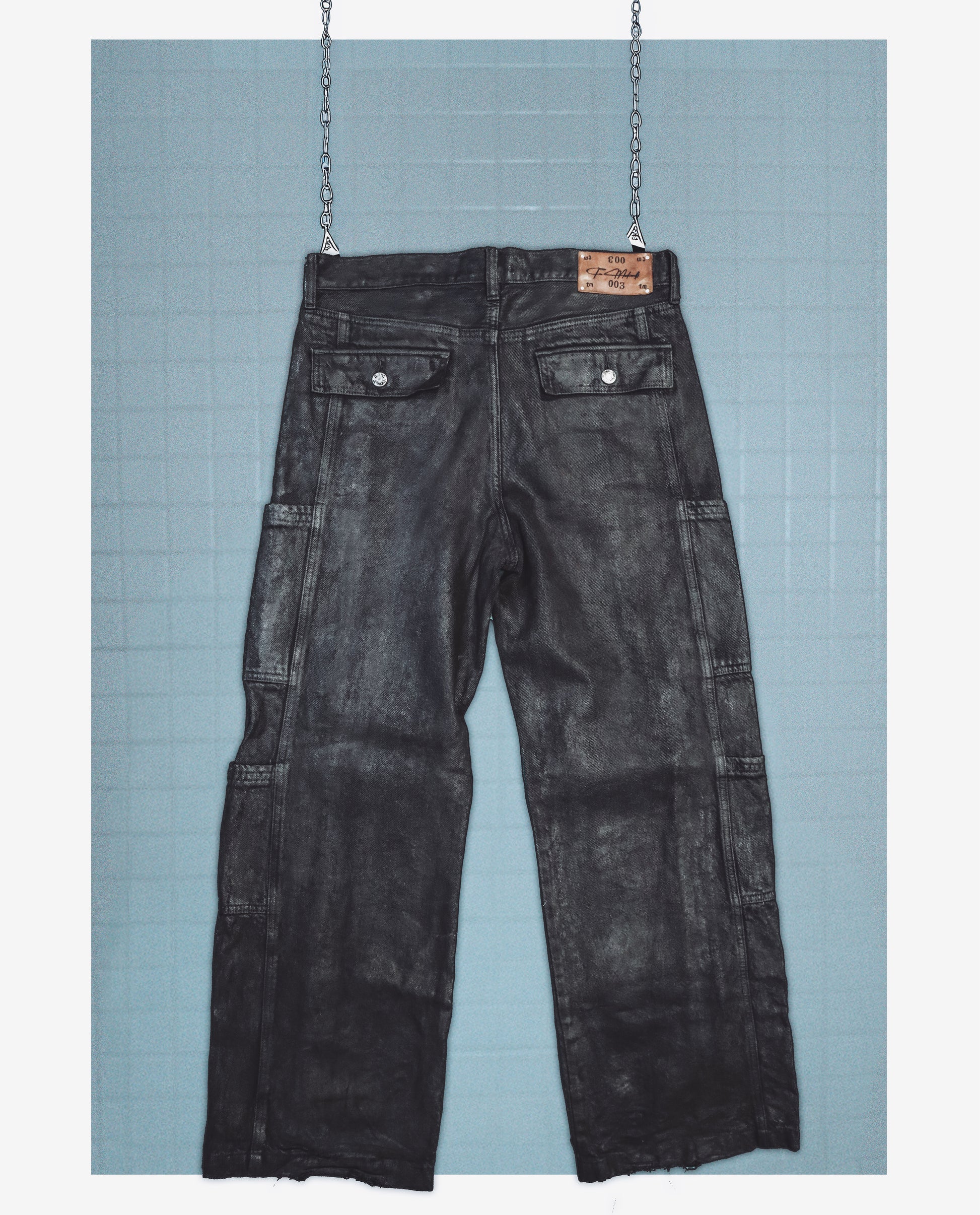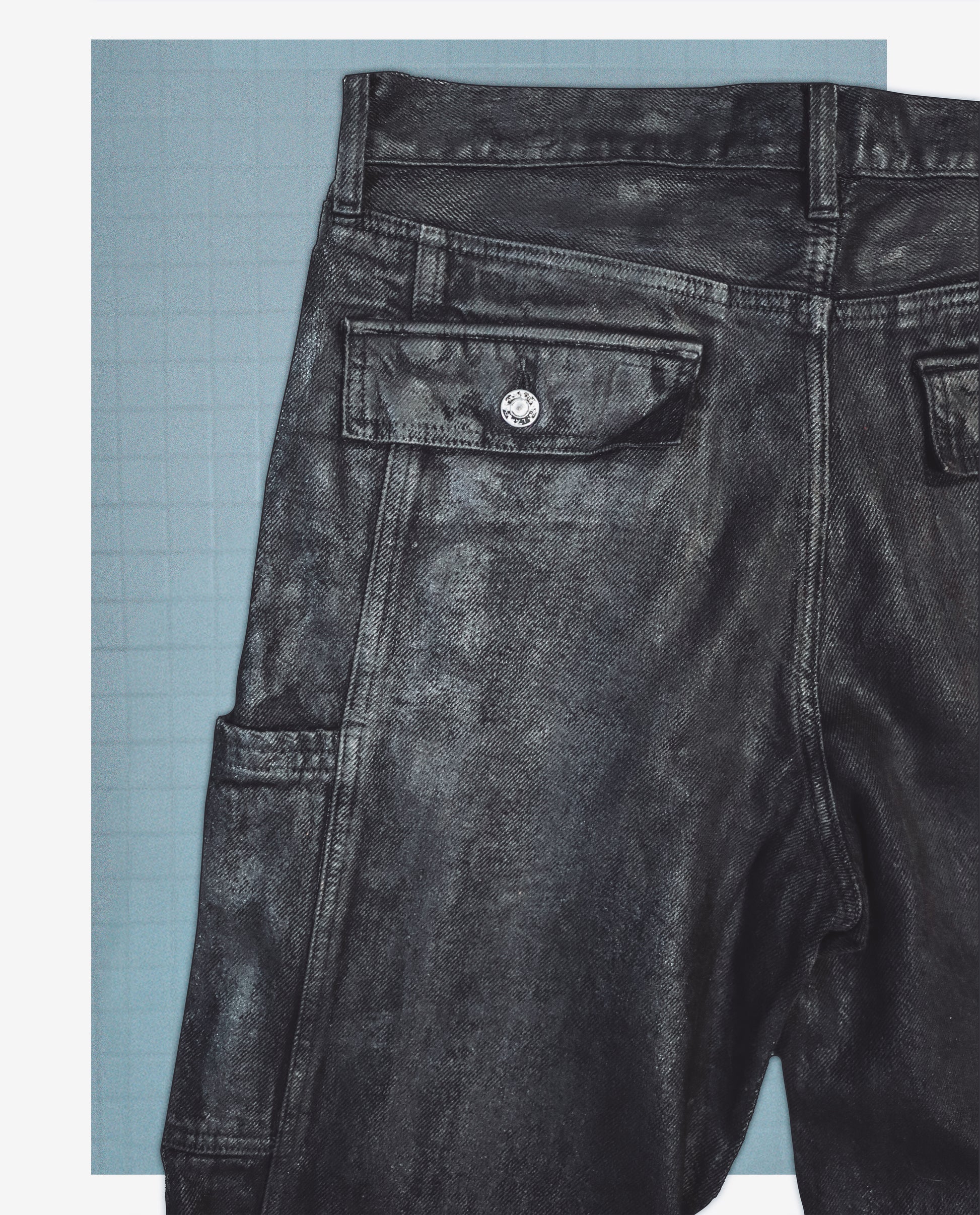 NOCTURNE CARGO 1 — Matte black cotton twill, coated in a soft metallic film that shifts between shadow and steel. The surface reads industrial—subtle sheen, structured folds, quiet tension in every seam.