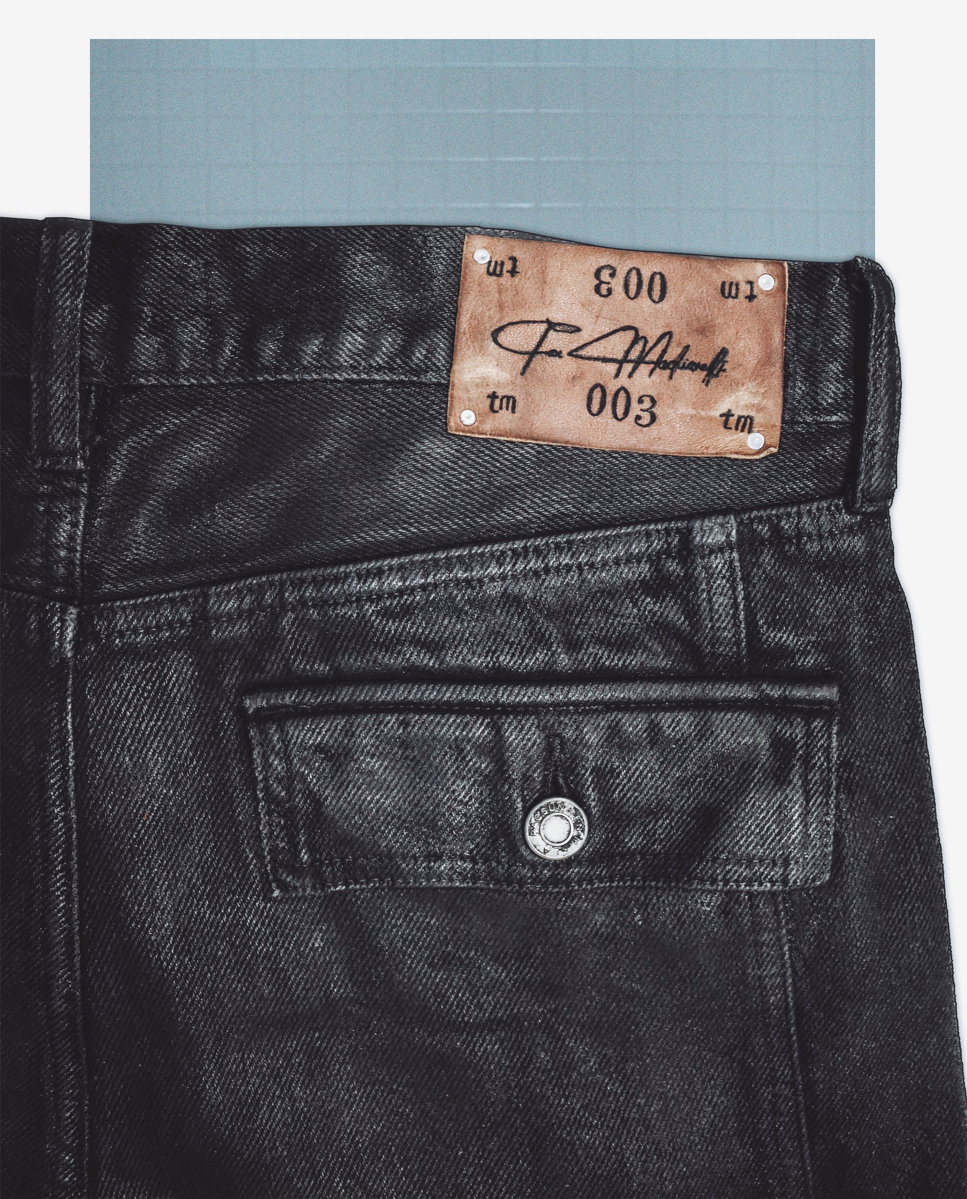 At the back, a leather patch tattooed by Tex Machiavelli serves as the only ornament—burned and inscribed by hand, a personal seal rather than branding.