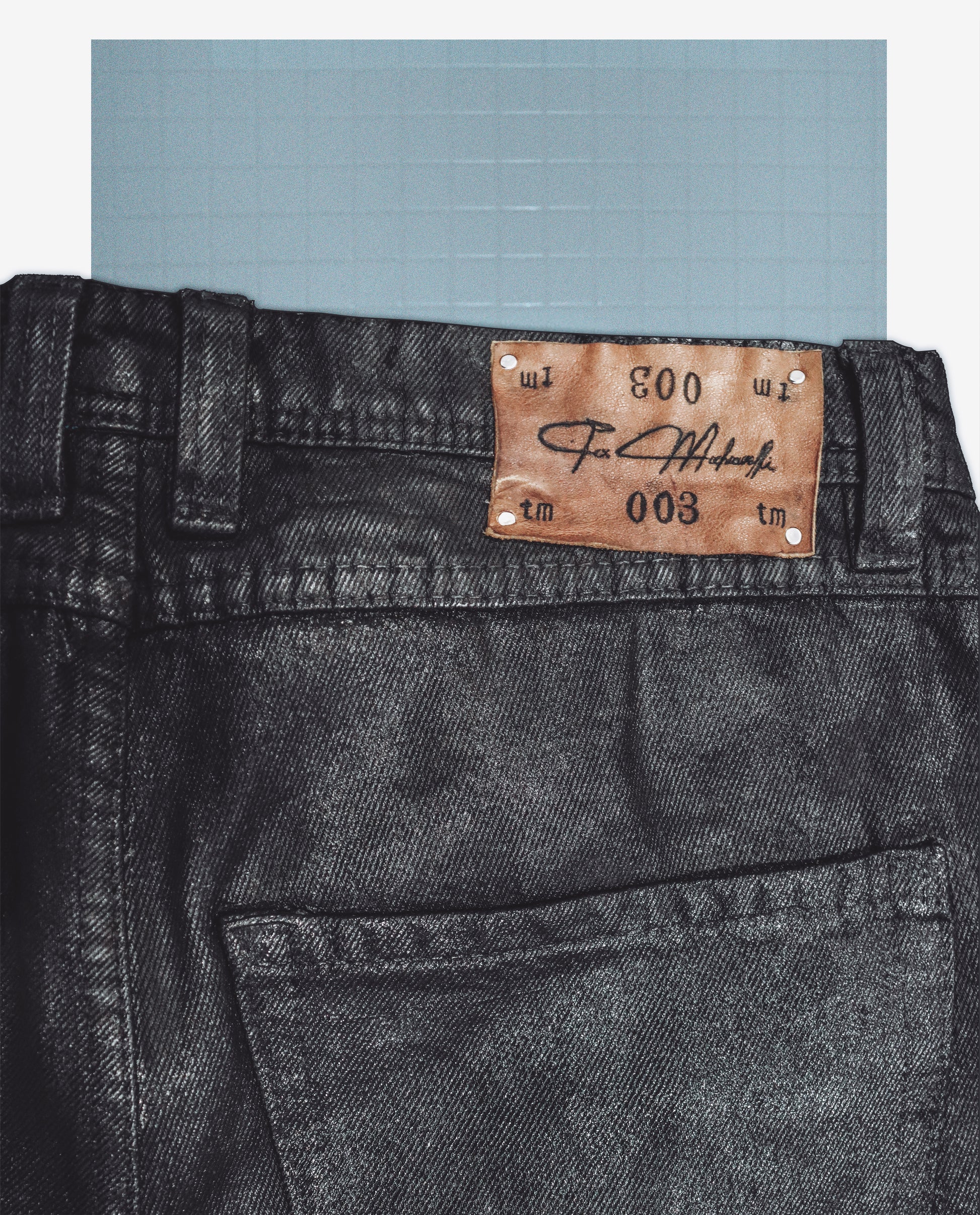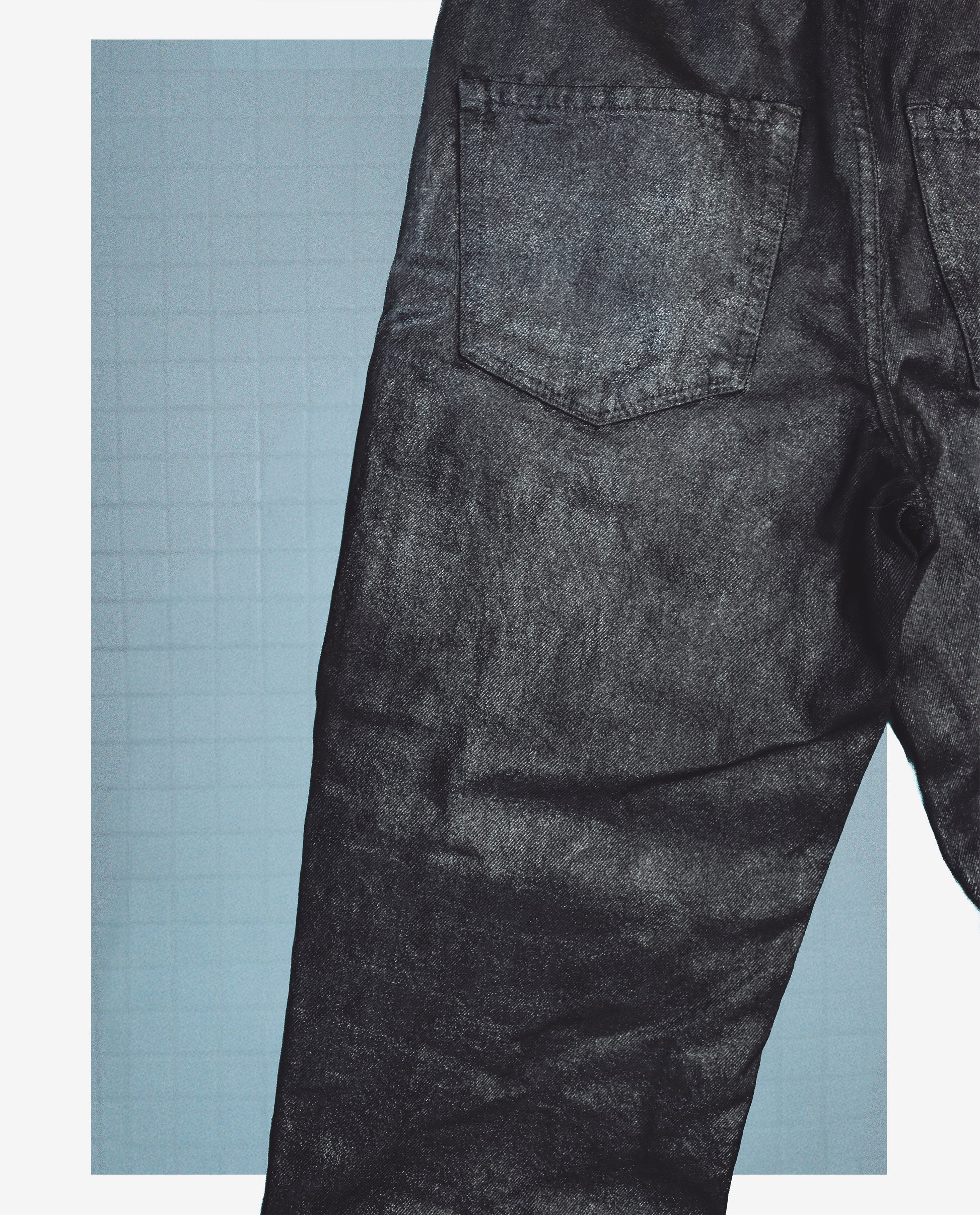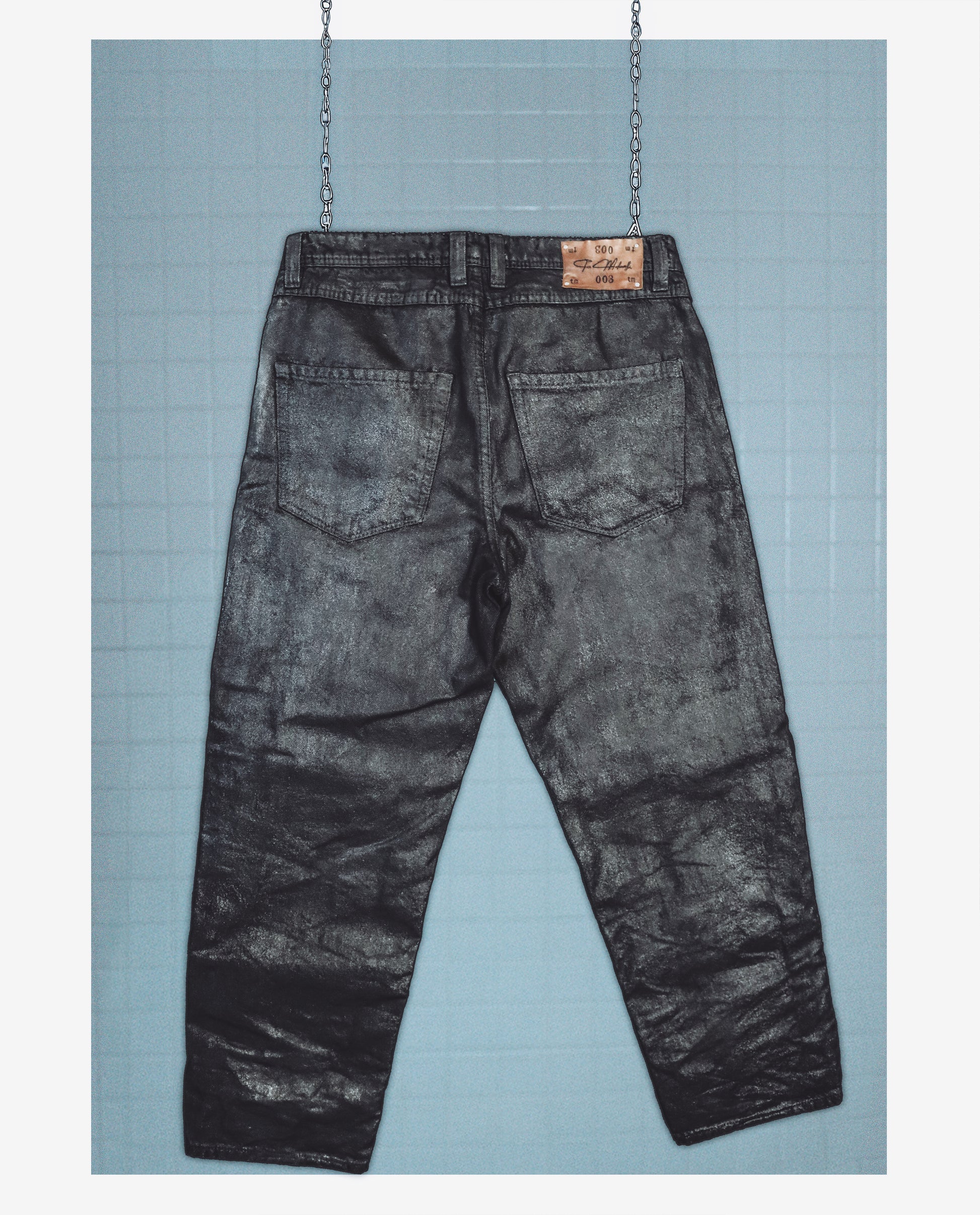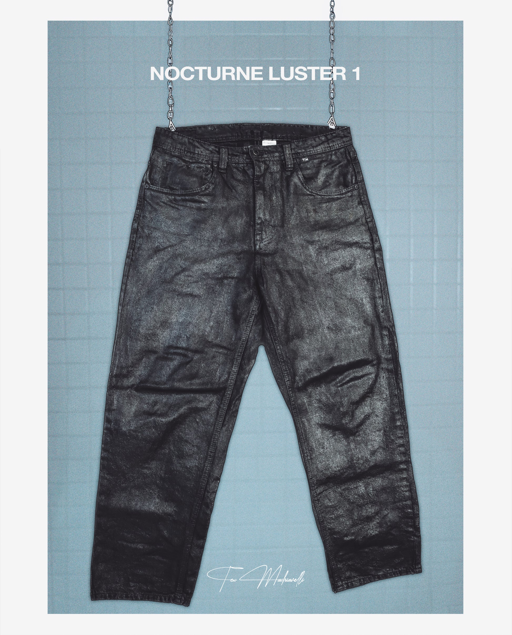 NOCTURNE LUSTER 1 — The foundational Luster silhouette. Heavy cotton denim coated in reflective black resin, yielding a metallic patina that catches light like wet stone. The surface holds both sheen and grit—industrial, mineral, alive under motion.