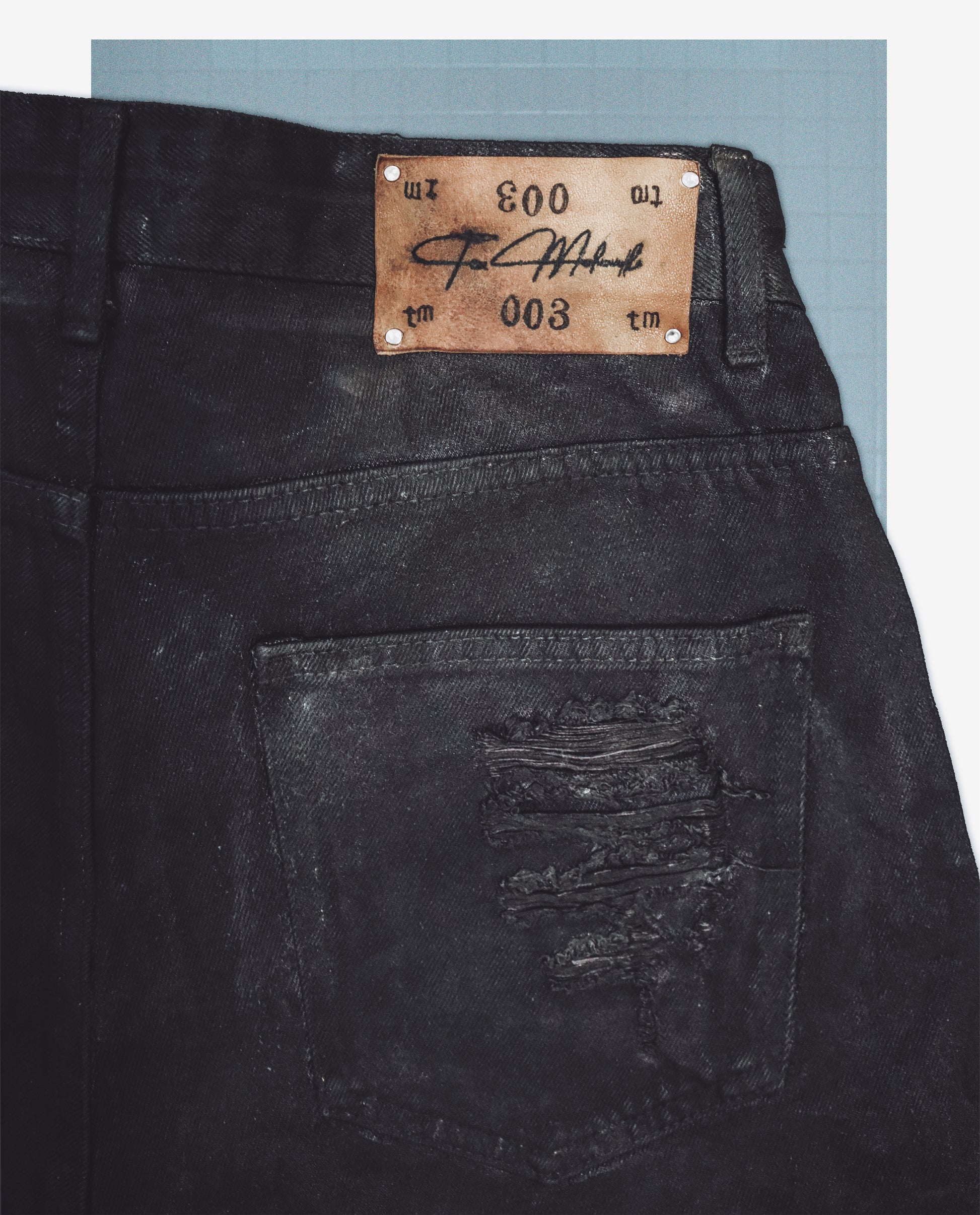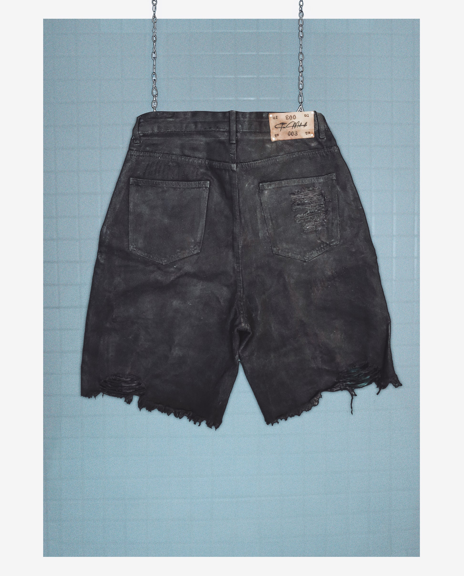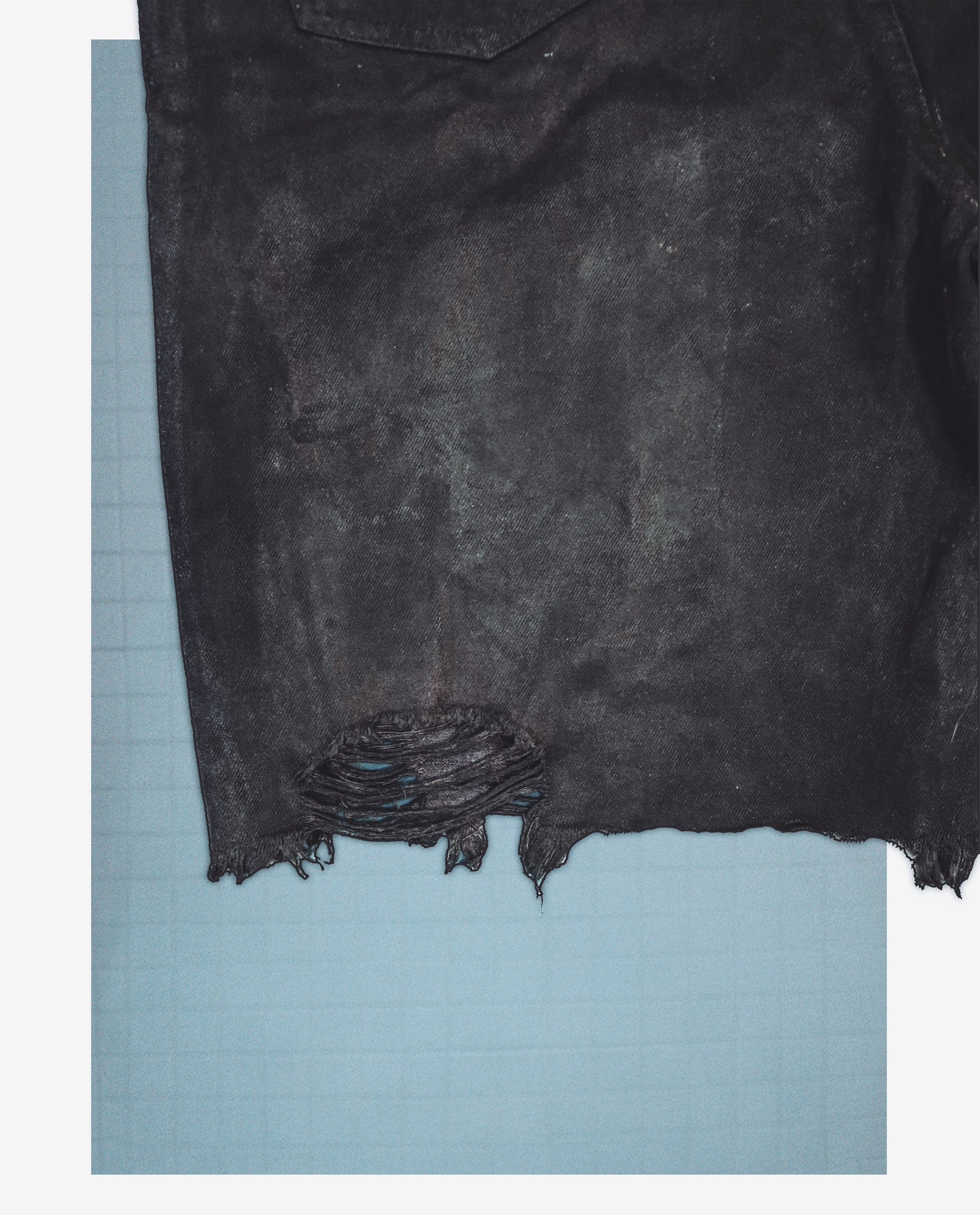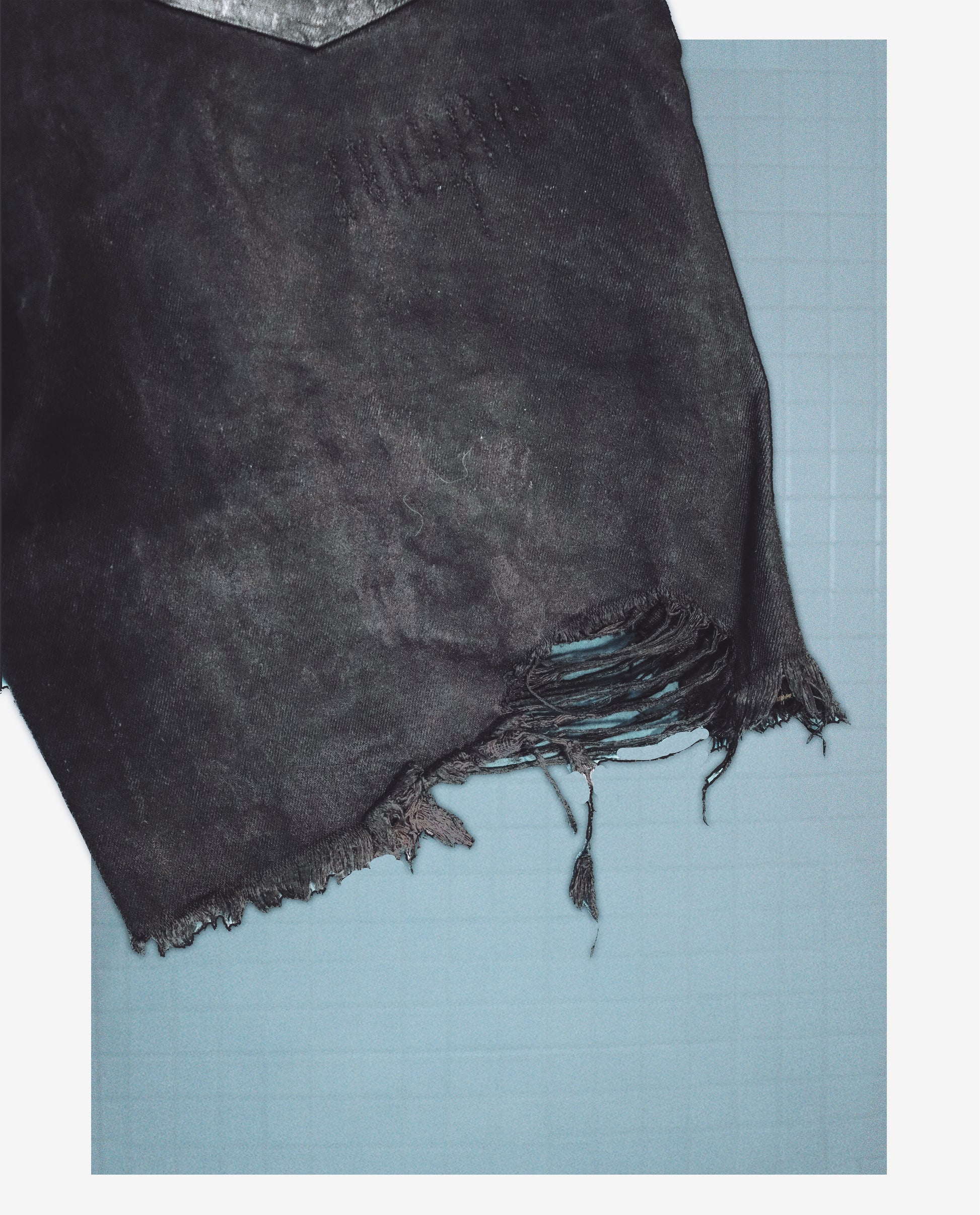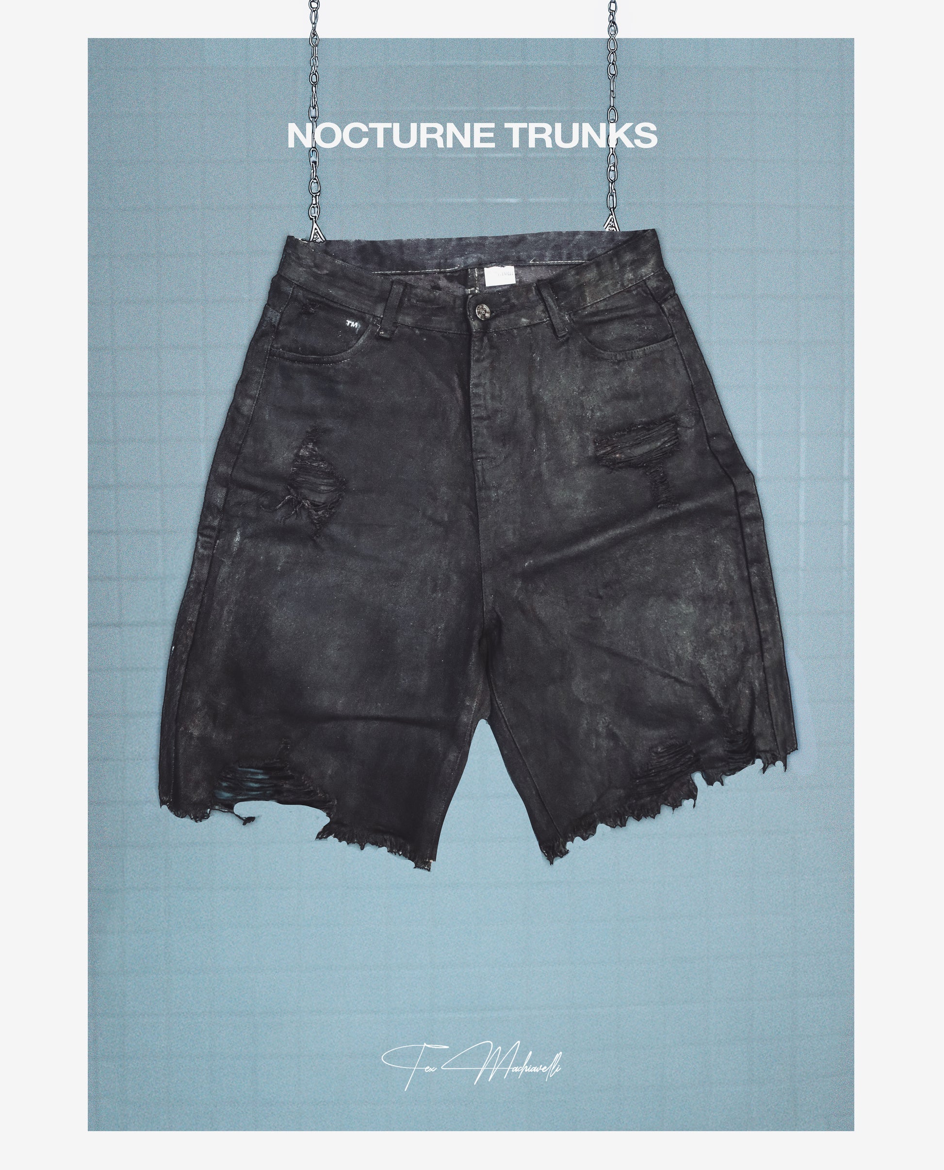 NOCTURNE TRUNK — Heavy blackened cotton, hand-coated and heat-sealed to a muted finish—matte, tactile, and weathered. The surface carries signs of abrasion and wear; edges slightly frayed, fabric softened by process and time.