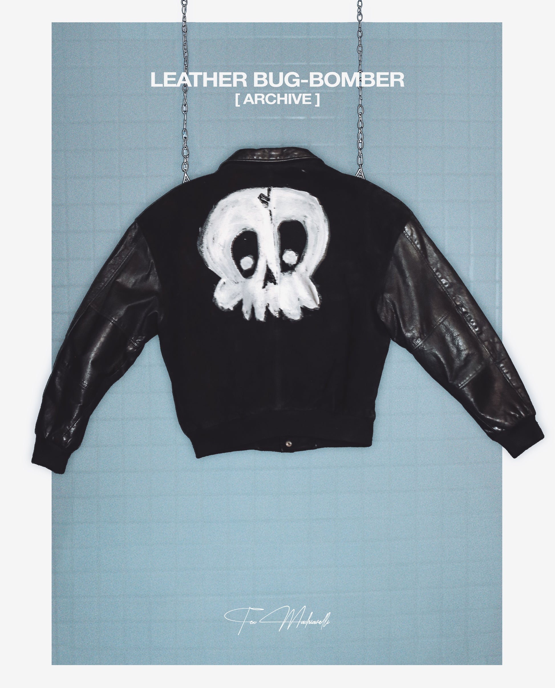 LEATHER BUG-BOMBER - Hand-stitched Vantablack suede body with calfskin leather arms. A varsity cut, reimagined through exhaustion and precision. Built like something stolen from an older brother — heavy, broken-in, and impossible to replace. Every panel drawn and cut by hand; no templates, no remakes. The surface eats light, leaving only shape and attitude.