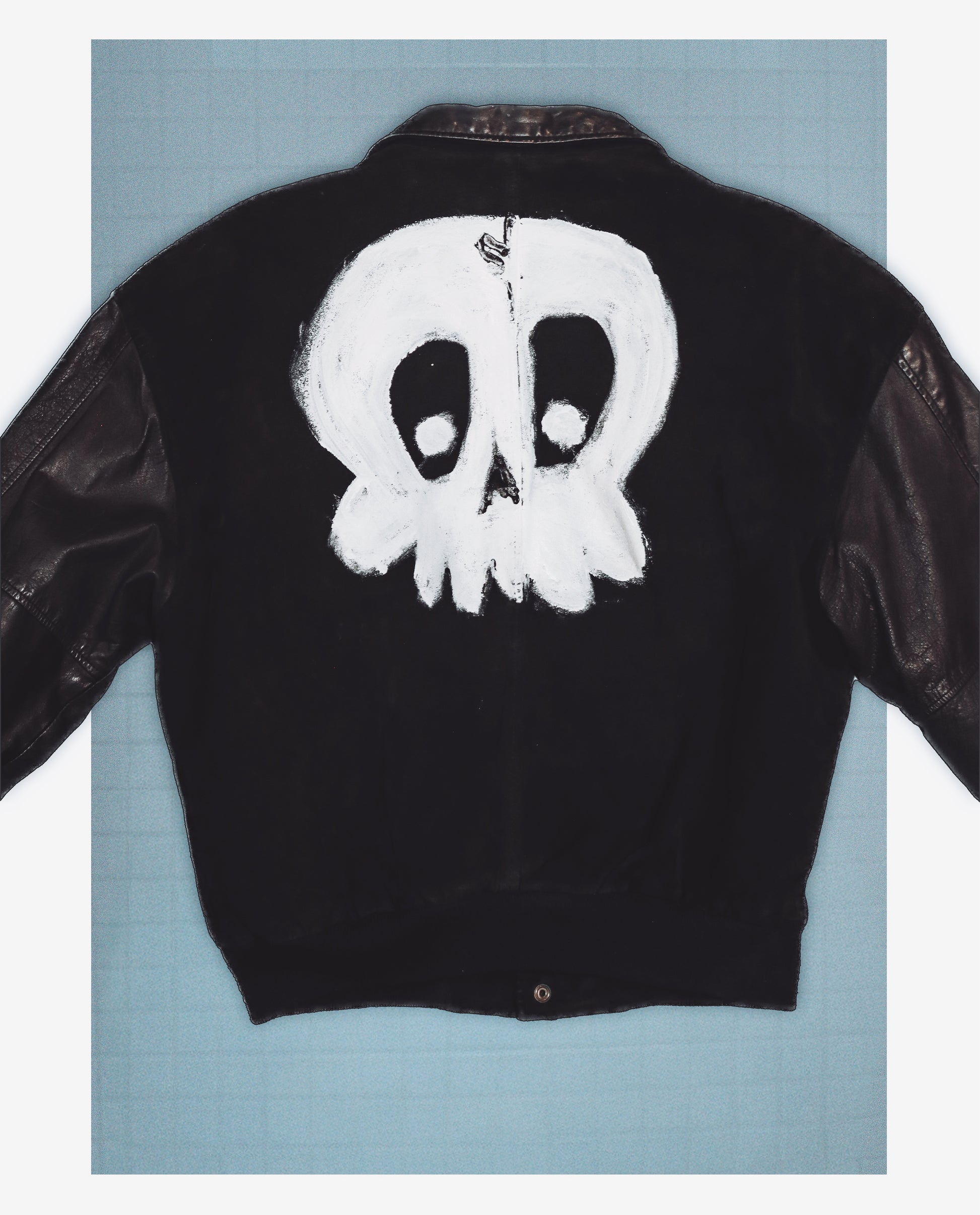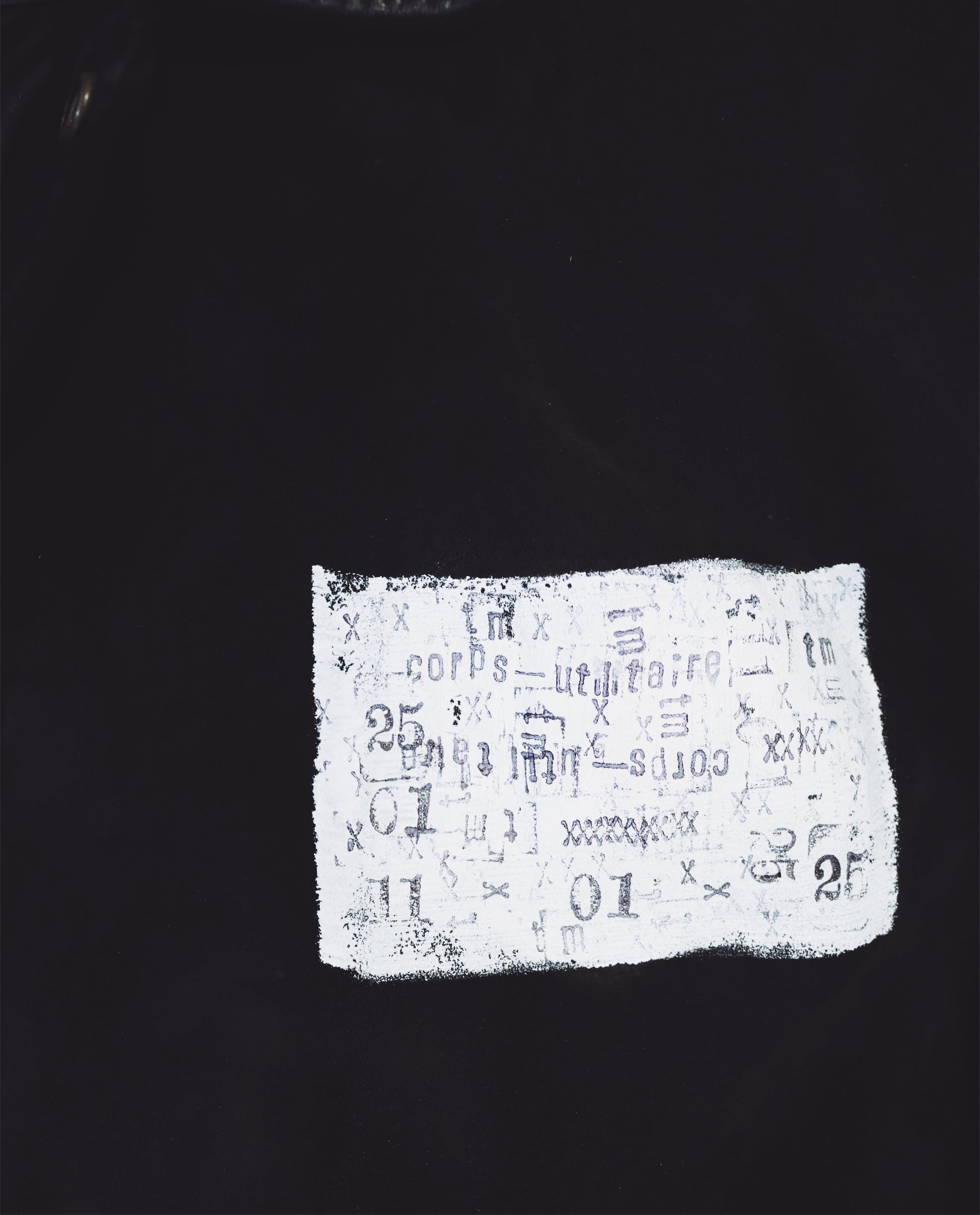 Across the back, a hand-painted plastisol skull, pulled from memory — a distorted echo of an archive relic Tex Machiavelli once saw in a private collection. The front carries a plastisol patch, stamped unevenly with text: Corps Utilitaire, 11 · 01 · 25, Tex Machiavelli. The rear bears a tattooed leather tag, riveted like a scar.