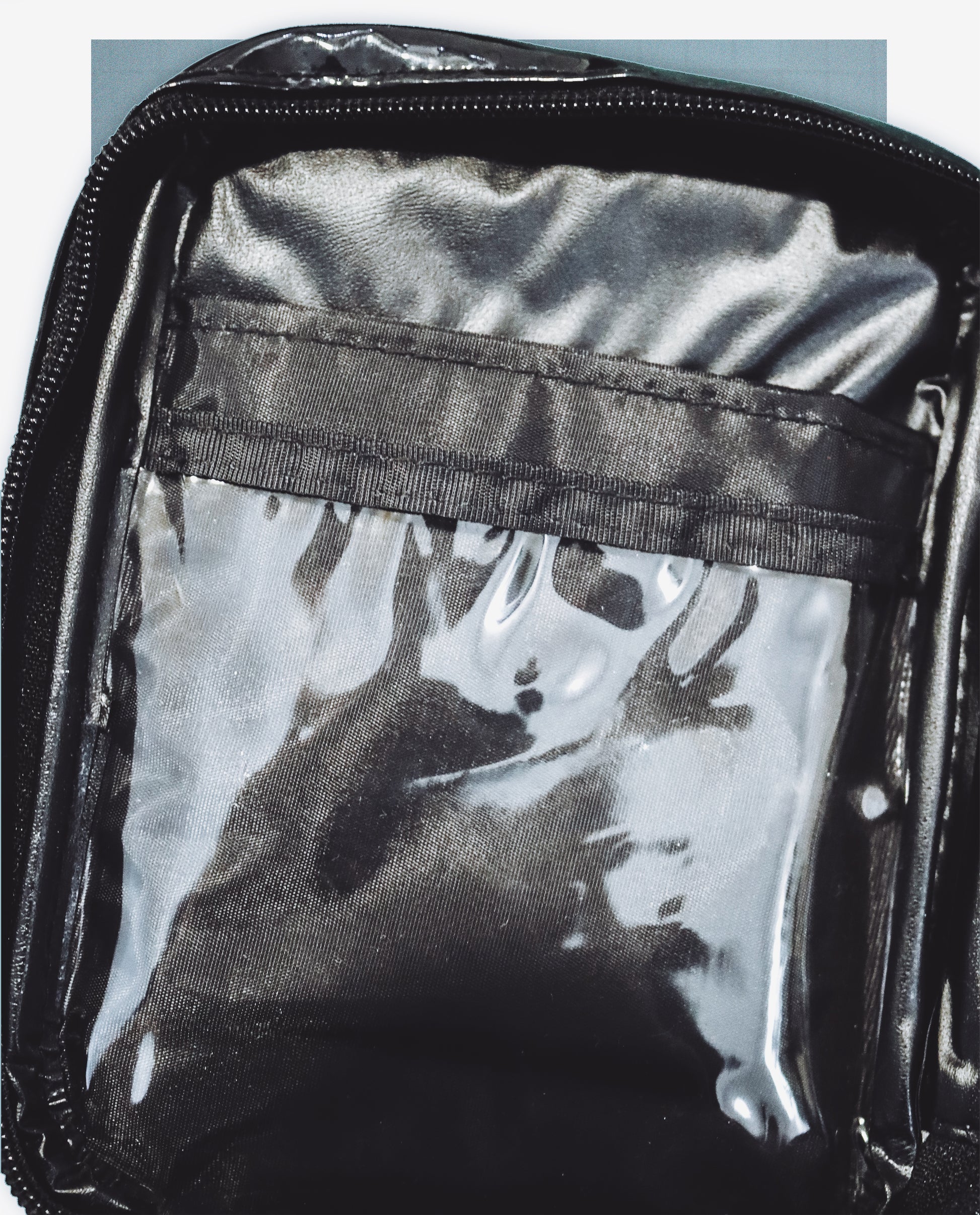 Acrylic faggbag - Compact. Opaque black shell, transparent core. Built to hold what doesn’t need to be seen but can’t be left behind — loot/vices/small indulgences. No strap, no ornament. Inside, a single leather tag, tattooed by Tex Machiavelli.