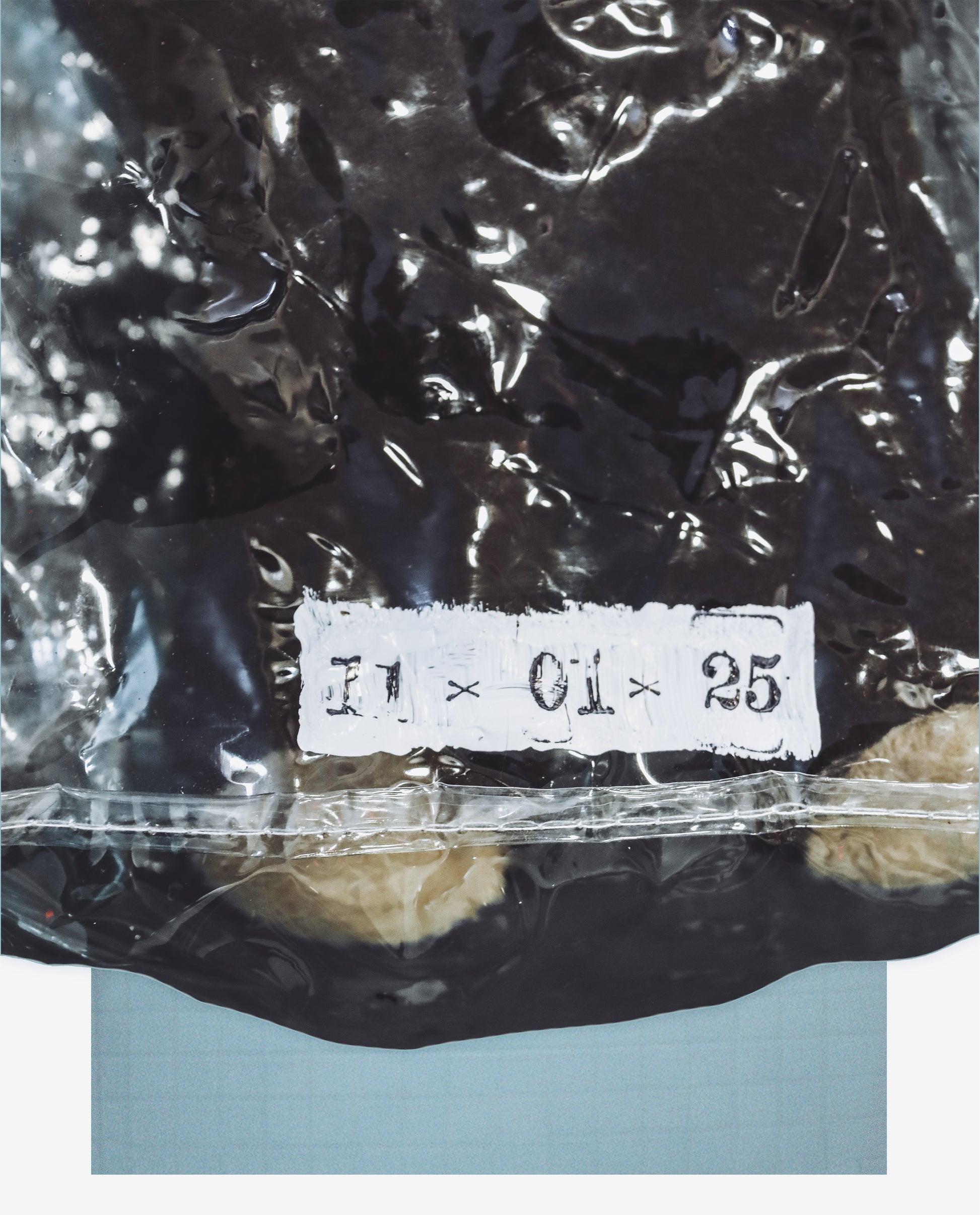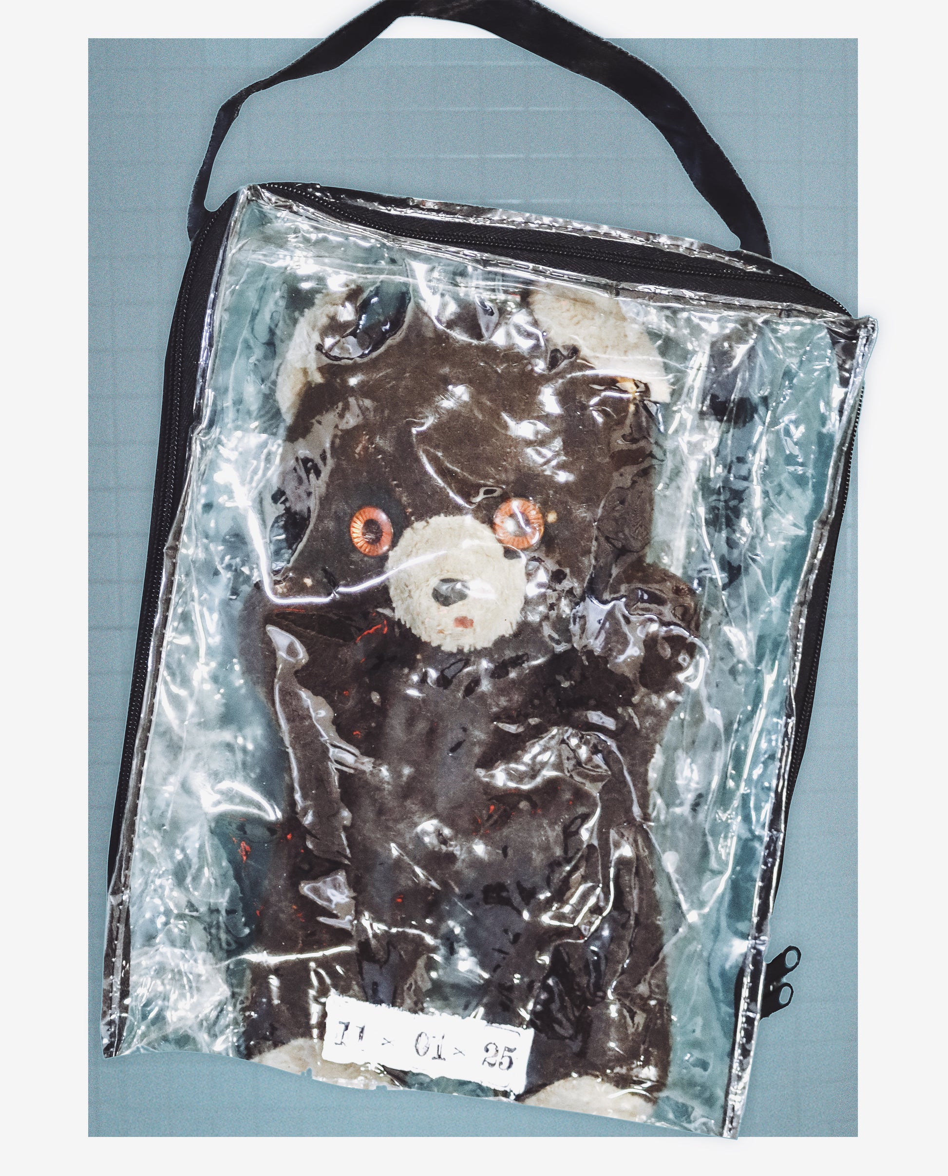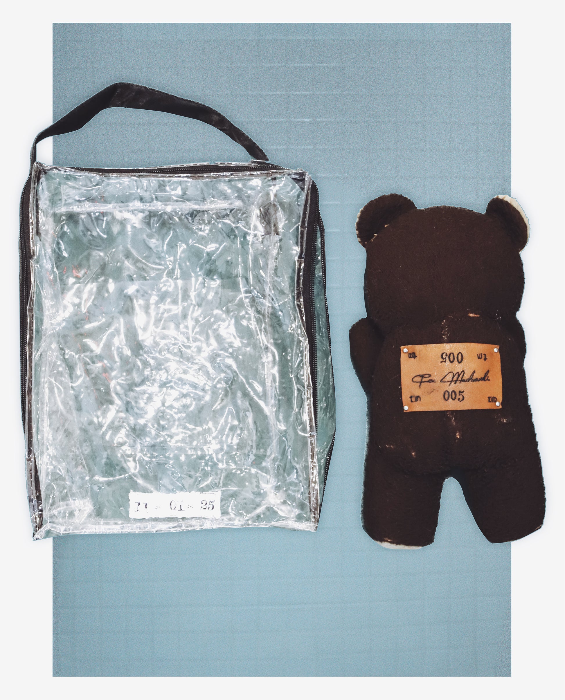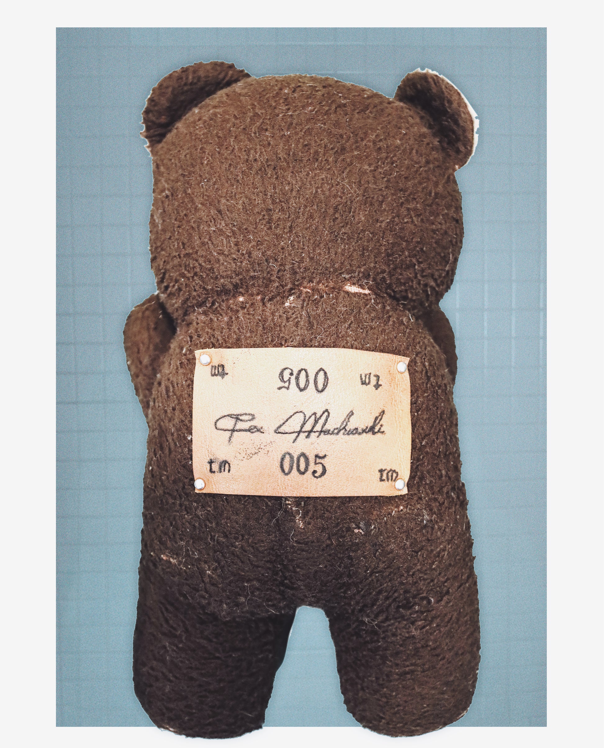 ACRYLIC PLUSH SET - A 1960s teddy bear, recovered, worn, and restrained within a square acrylic case — built to display rather than comfort. Its fur is matted, its expression faintly unsettled. A tattooed leather tag by Tex Machiavelli is riveted into the bear’s back — a mark of possession and preservation. Below, a plastisol imprint: 11 · 01 · 25, recalling the Corps Utilitaire release.