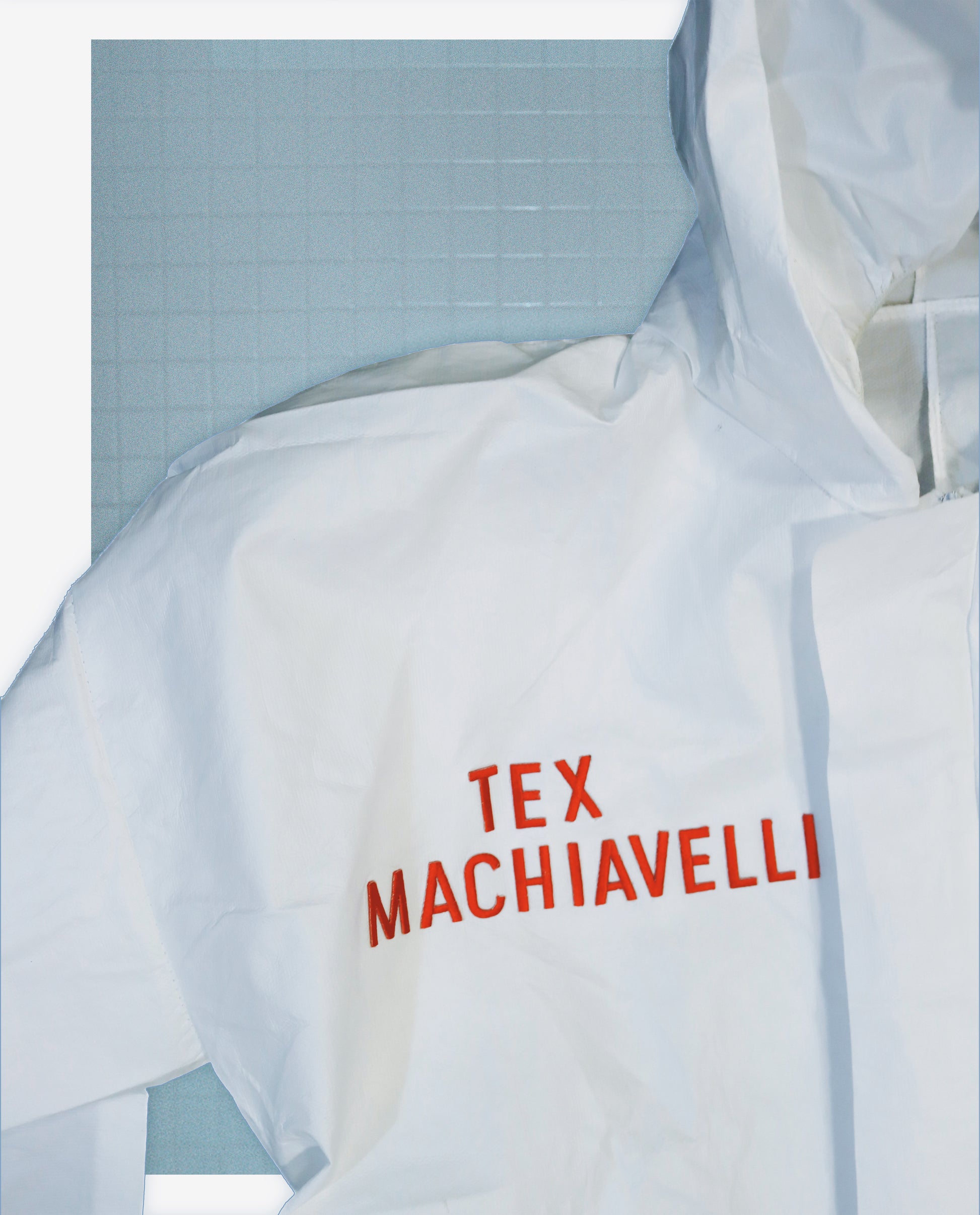 On the right chest, Tex Machiavelli is embroidered in red—clean, surgical, and assertive. The contrast between white and red is deliberate: purity against intent, control against creation.